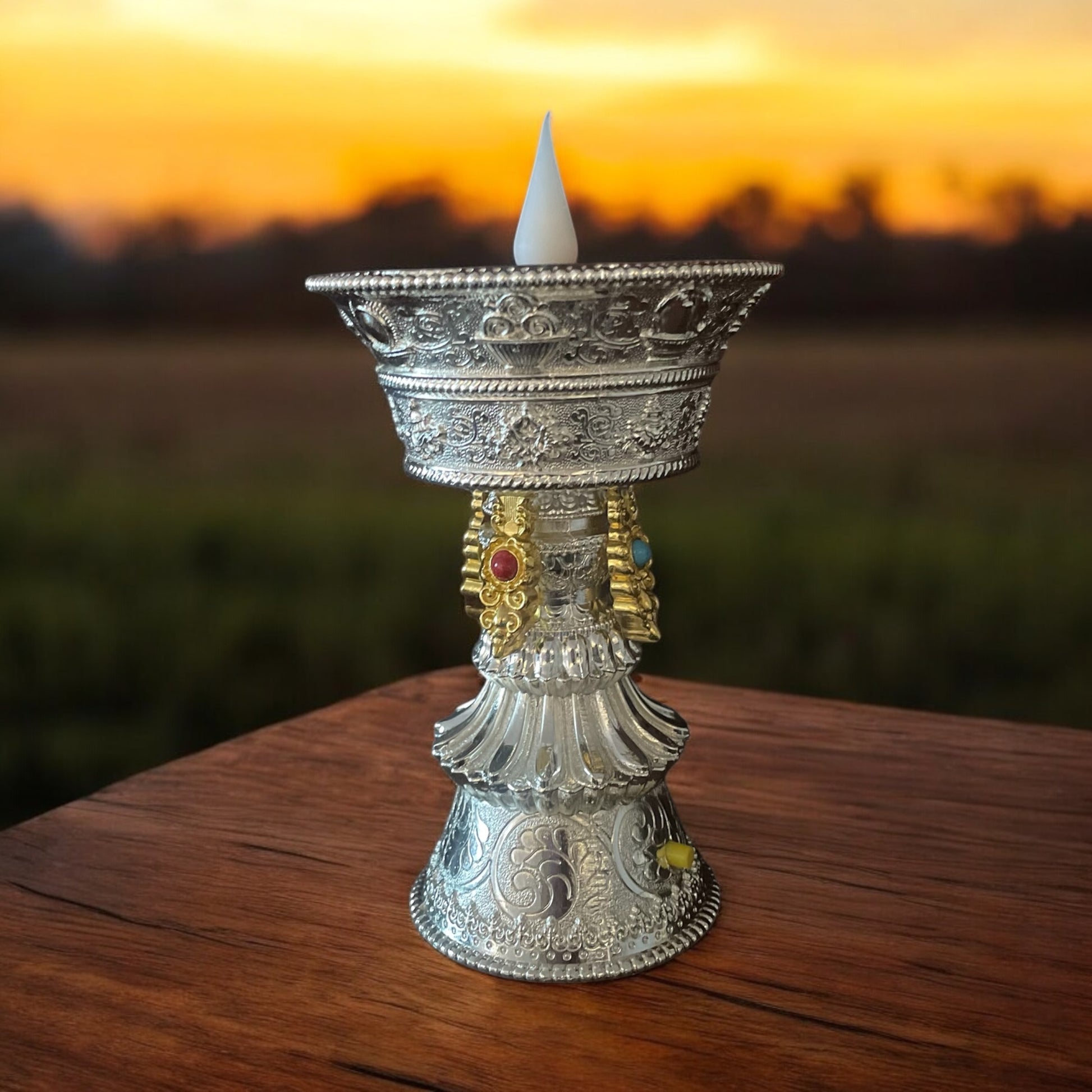 Crafted with a beautiful Tibetan design, the Chemi lamp is a unique addition to any space. Powered by an electric battery charge, it boasts a long battery life and eliminates the risk of fire hazards. Enjoy its warm glow with peace of mind.