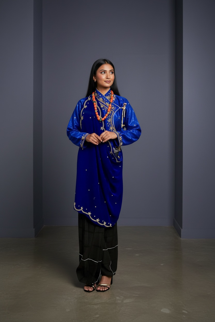 Discover the magic of our stunning Gurung Ghalek—a velvet treasure adorned with exquisite boutique embroidery that's pure artistry. Each stitch tells a story of craftsmanship and cultural heritage, making this piece a showstopper for anyone who appreciates the finer things. Wrapped in sumptuous velvet and finished with meticulous detail, it's the kind of garment that turns heads and sparks conversations. Elevate your wardrobe with this beautiful, high-quality essential that celebrates tradition with style.